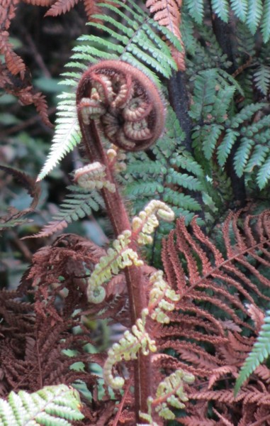 Red fern along a path