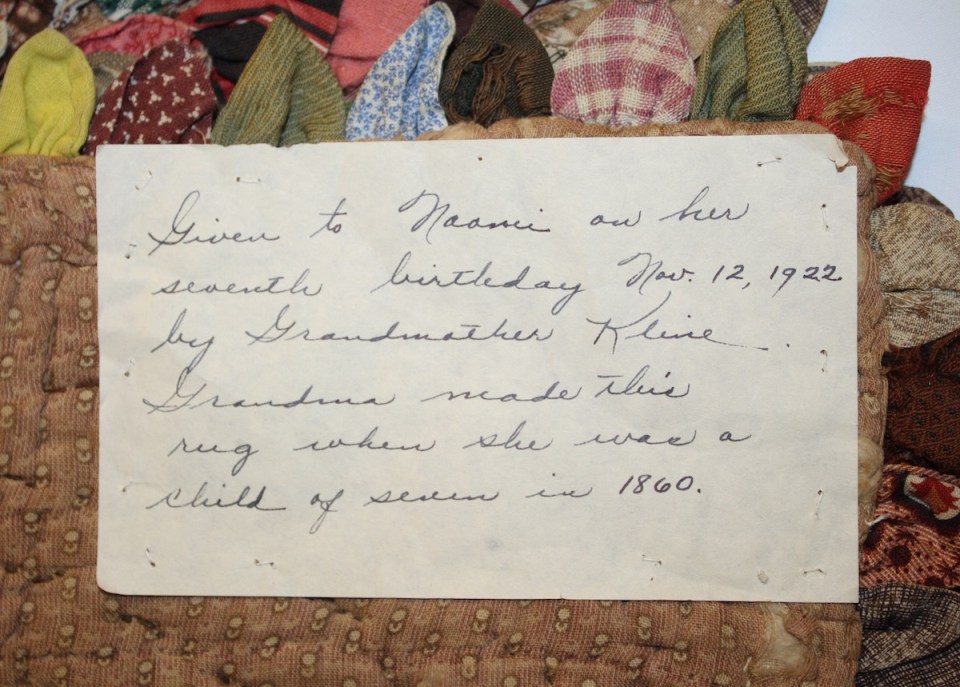 Nailor Antiques label for tongue mat ← Previous Next → label on tabletop mat made with cotton fabrics in 1860 by 7 year old