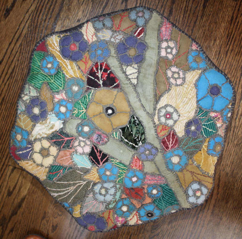 w Ellie Schauls’s footstool McDonalds top ← Previous Next → top of footstool in private collection collage fabric, embroidered by Blanche McDonald, Letter Gap, WV