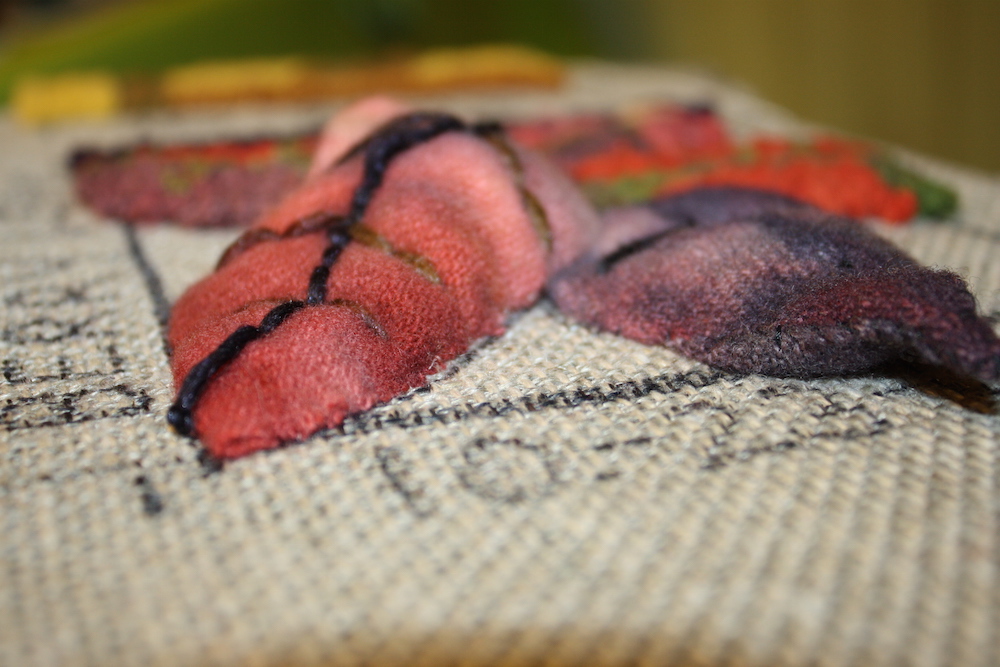 blackberry-leaves-10-23-side-view-stuffed ← Previous Next → Stuffed and embroidered hand dyed wool fabric, yarn embroidered