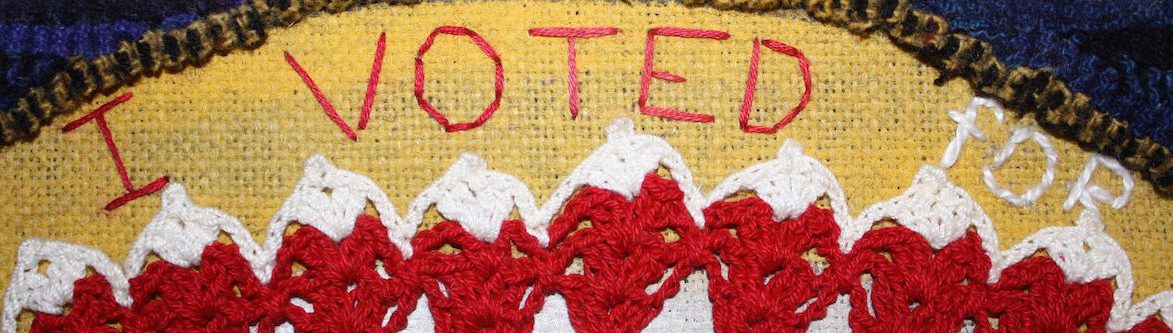 Iconic VOTE Susan L Feller Next → I VOTED mixed media: paint, cotton thread, wool fabric, crocheted doily
