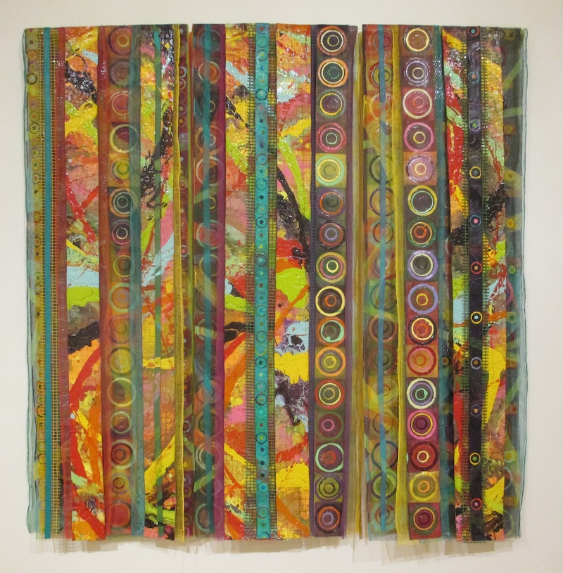 fragments-reni-gower-mixed-media-panels ← Previous Next → Fragments, Reni Gower, mixed media three panels of strips incorporating layers of mixed materials