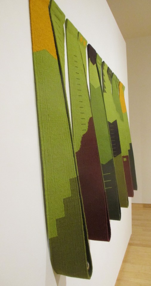 verdant-2010-susan-iverson-wool-tapestry-and-glass ← Previous Next → Verdant 2010, Susan Iverson wool tapestry, glass six panels draped with glass ball cradled in each