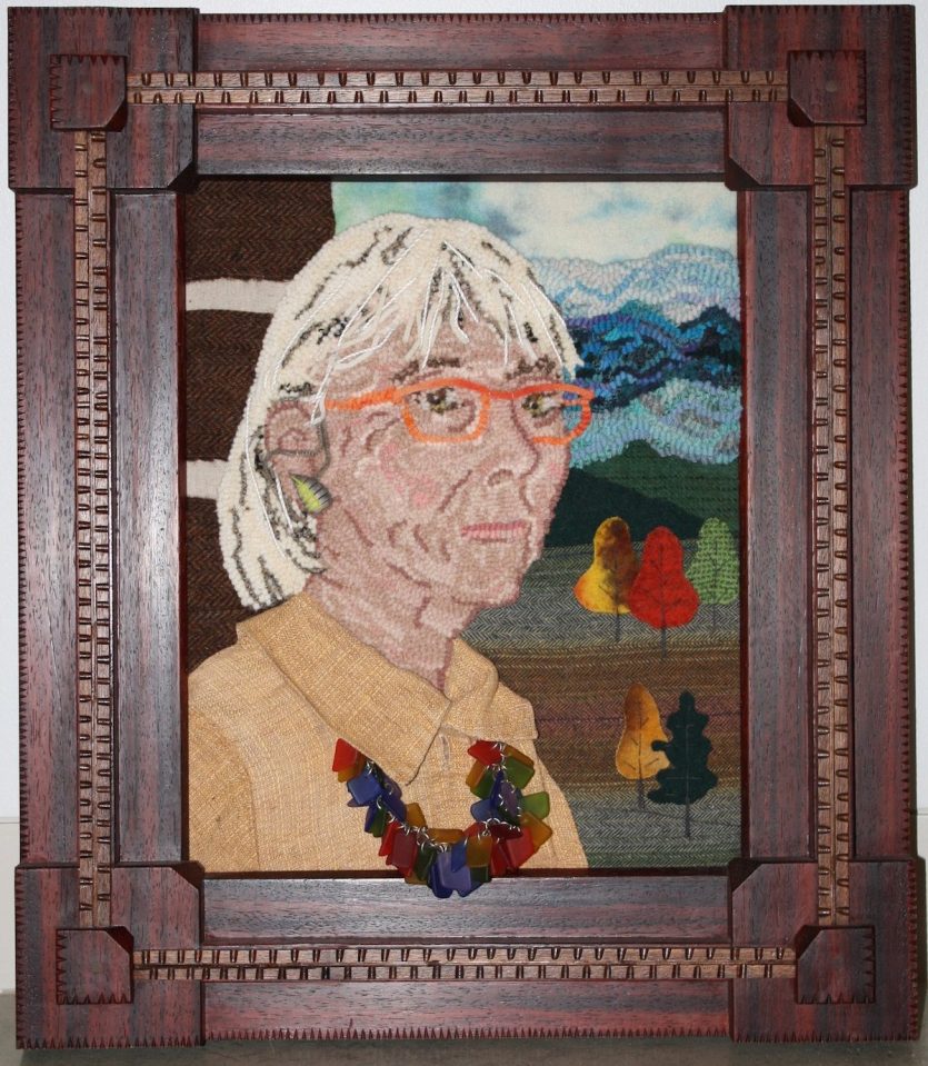 Portrait Rugs Susan L Feller Susan @ 60 ← Previous Next → Susan @ 60″, Susan L Feller, Augusta, WV mixed media hooked, applique’, jewelry, hand carved frame by Jim Lilly