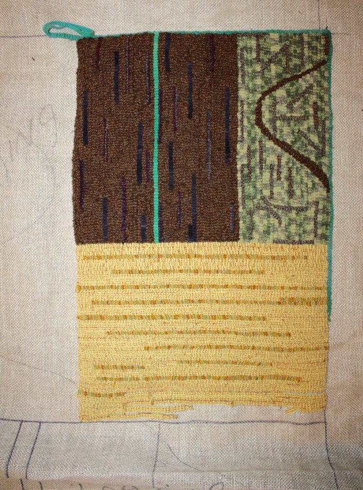 Lines: pipe, haying and logging first three sections ← Previous Next → pipe in dirt, logging, hay field wool strips of fabric hooked through linen backing. Green is hand dyed others off the bolt