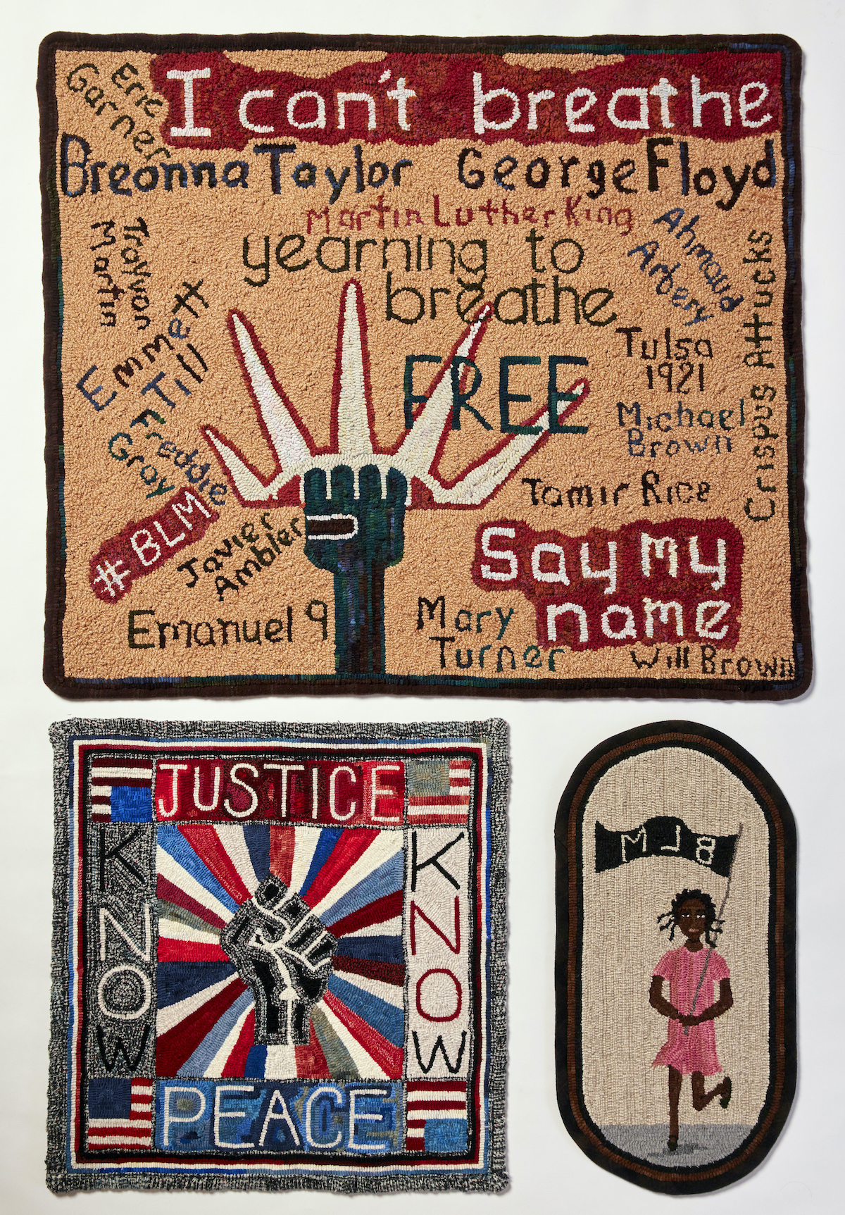 By taking hooked rugs off the floor and presenting them as art my work has been accepted in exhibitions and become ambassadors for traditional handicrafts speaking about society in the 21st century. Developing a strong social media presence brings awareness, uniting others.