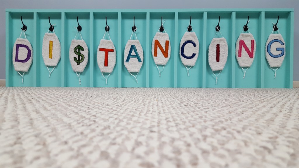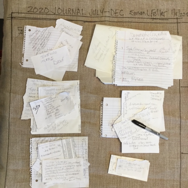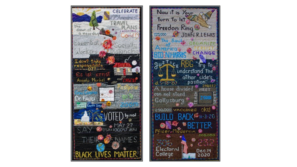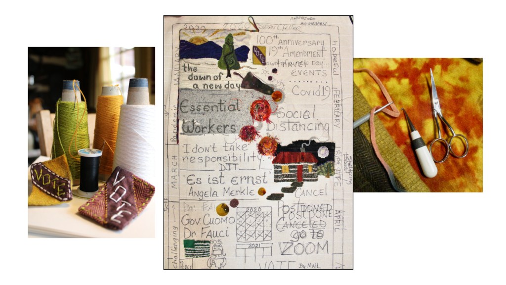 I constantly write quotes and important dates on scraps of paper because I like history. In 2020 they piled up and haunted me. All the noise coming through radio, media outlets and rattling around my head had to be organized, edited and preserved through art = my personal story. Via zoom I talked with many other textile artists who had spent their hours pulling loops and stitching work that would last beyond these days. They were my inspiration and helped in finding my own voice.