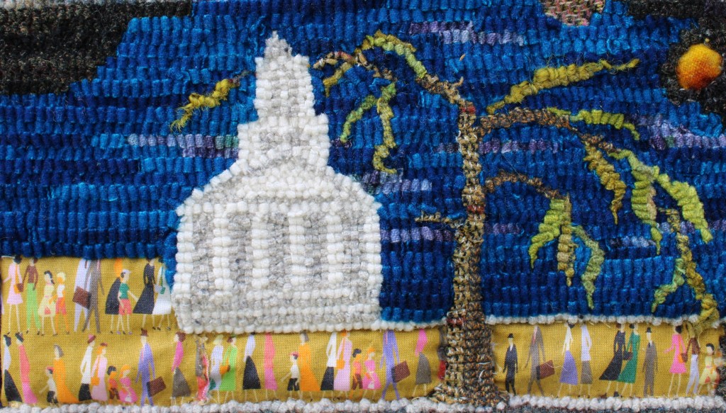 Men and women pulled loops in simple geometrics selecting reds to depict the virus, or multi colors haphazardly chosen from the scraps just to be making something during the long hours of lockdown. Our conversations connected us because of the art.