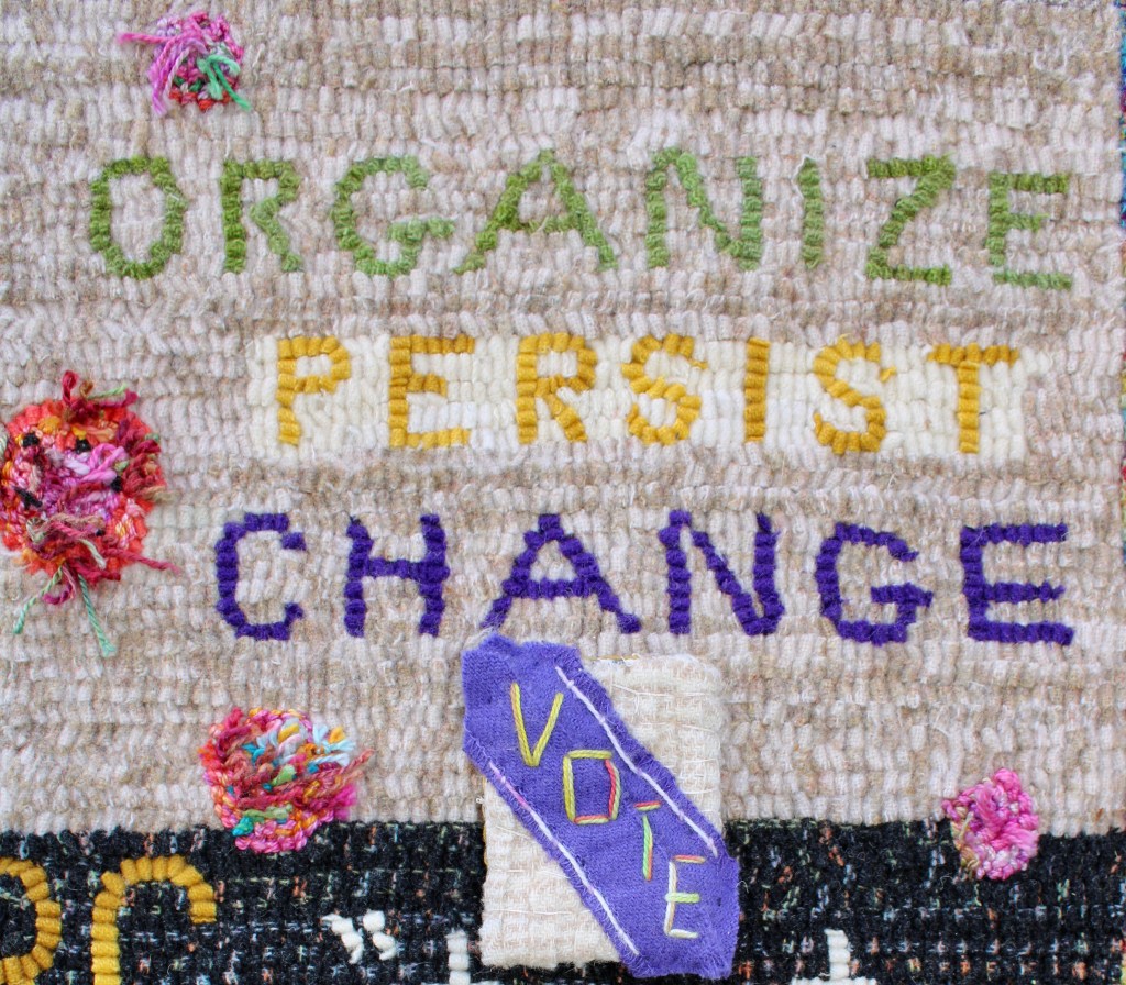 I began a series titled Pussycat Pillow Talk with hooked images on the front and embroidered messages on the reverse. Themes have been #metoo movement, persistence, gender equality, climate change, Love, and whatever other social issue can be summed up in a few words. The collection is growing.