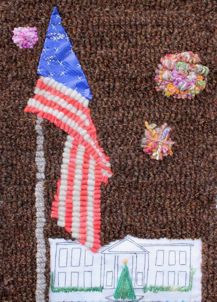 The first panel came together over the months of July and August. I hooked away listening to the Conventions, jotting down more quotes as the loops filled in the spaces. I thought the second composition would continue right away but found I had to put it aside until March of 2021. With distance it flowed easily, after a few adjustments the second six months panel was completed in just 28 days. I did not compare them except for the checklist of designing. The border uses the same rainbow fabric from Dorr Mill and two rows of black fabric (although slightly different) ties them together along with the monthly change in values and visual pattern. These must be seen to appreciate the multiple stories and techniques. Their first exhibit was an invitational “Social Studies” at Beckley Art Center, Beckley, WV May 14 – June 19, 2021. Here are some detail images.