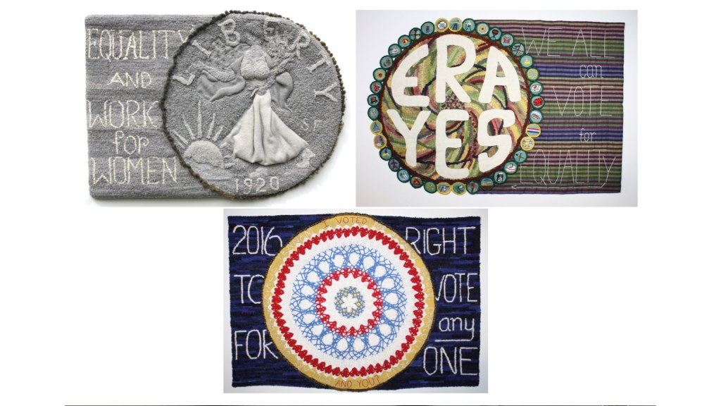 Iconic triptych spans a century of women’s rights leading to 2016 issue of voting rights for all. The neutral coloring representing 1920 and the ratification of the 19th Amendment adds to the history. By 1973 and the ERA passing from Congress for the states to ratify (still not 50 years later) I used my own Girl Scout badges and a rainbow of colors to portray my youthful outlook on the future. The VOTE palette proudly signals the USA. Names of women I voted for are embroidered around the red, white and blue crocheted doily.