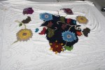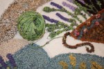 Tape the cans together, six around one in center. Trace this shape on paper and use as template for pattern. Draw onto backing and gather your fabrics, threads, tools. This is the time to play. The McDonald Sisters’ compositions all conjure up gardens and nature. They collaged scraps of velvet, brocades and drapery fabric common in the 1960’s in central West Virginia and any rural community in the United States. The shapes were defined with yarns unevenly anchoring the edges of each petal or stem. Some other materials used to embellish were unraveled copper threads from a Brillo pad which have tarnished over the years but still have a twinkle hint of metal.
