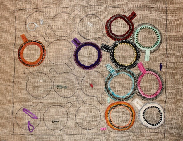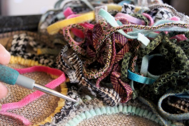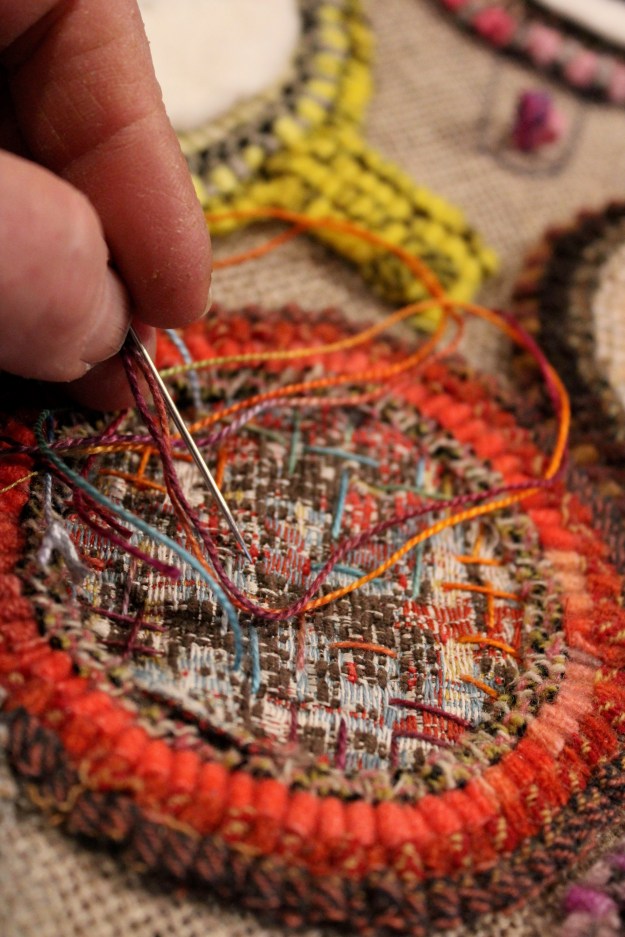 hooked fabric strips, embroidery on upholstery fabric, inspired by Hannah Lenhart’s pottery with ribbon border