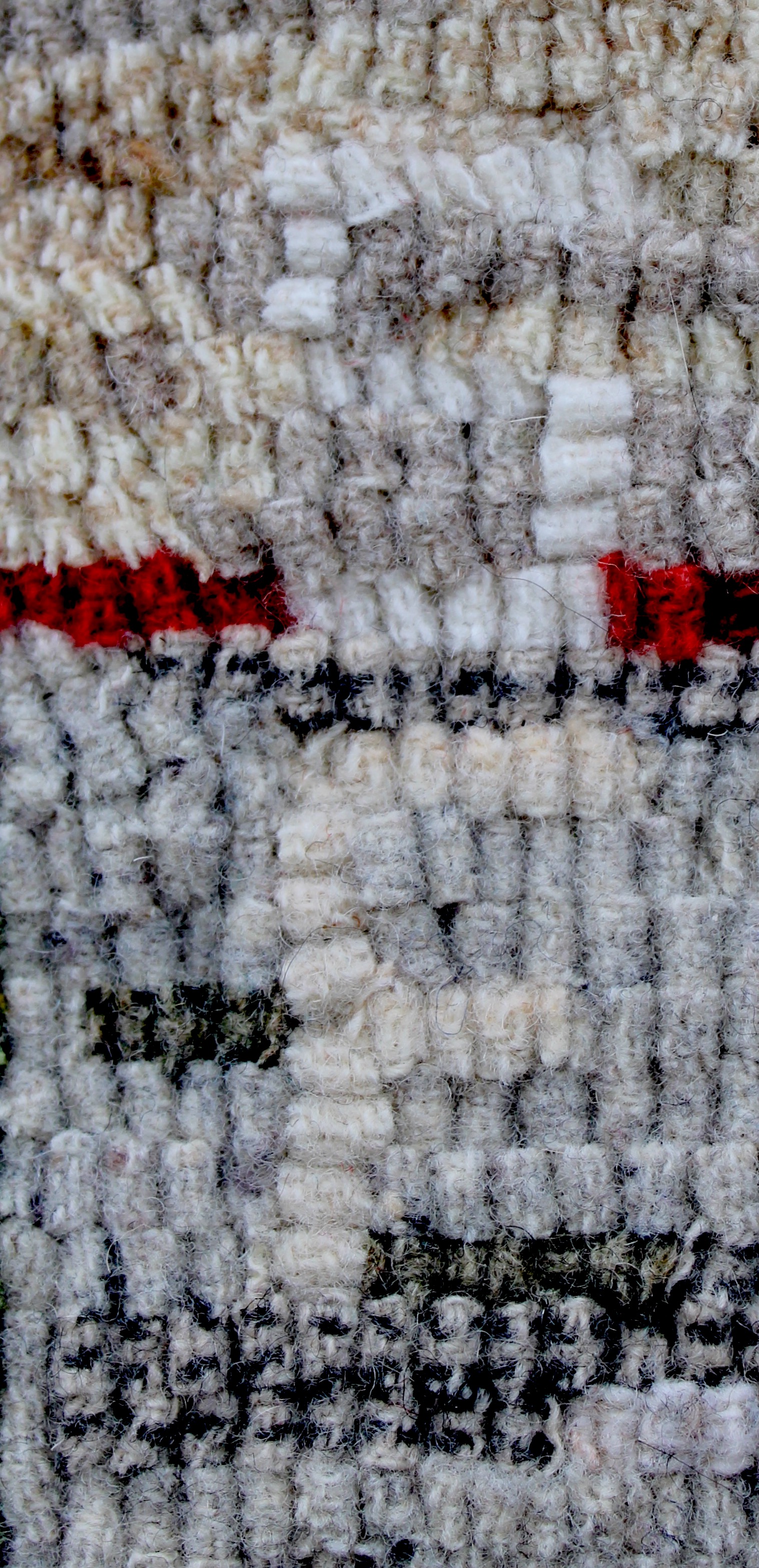 One of her vases became the “pattern” for 4″ circular shapes on graph paper to space them in ordered randomness. When I drew out with pencil, sharpened the lines with magic marker it was ready to use the lightbox and transfer to linen backing as a 24 x 20 design. THEN bags of wools came out, organized in color families with patterns and solids abounding to cut into strips. The variety of black and white squiggles and lines Hannah incorporates in her work were fun to interpret with high contrasting tweeds, plaids and checks. To get the color playing with black I used a technique called “beading” where two high contrasting strips of wool travel along, each contributing a loop in an alternating fashion.