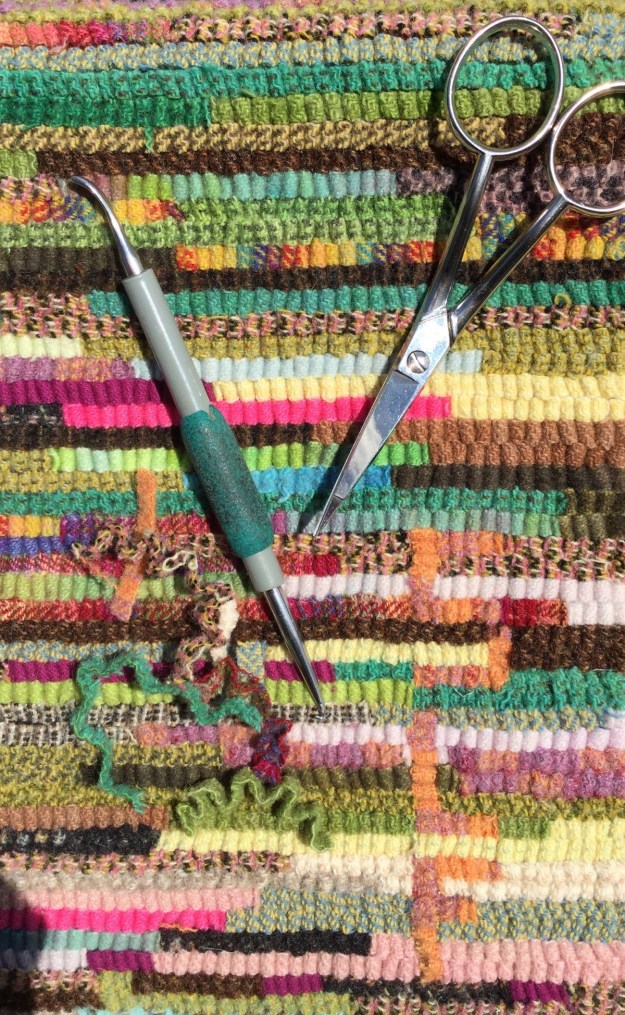 Working with our hands leaves less time to type on keyboards, or read a book but podcasts and videos are good company in our studios. Gene Shepherd from California knows how to teach with videos. His beginning loop pulling video has given people in Australia, England and North America the confidence to build a stash of fabric and make rugs. The website GeneShepherd.com shows his store of patterns and supplies, workshops, and a subscription Internet Rug Camp where over 75 videos and daily blog posts are archived for members. Deanne Fitzpatrick from her Amherst, Nova Scotia studio has encouraged us to “Create Beauty Everyday”. Subscribe to the podcast of the same name, there will be conversations with interesting fiber artists. She has a way of chatting on videos on YouTube as Deanne Fitzpatrickand blogs as if you are right there pulling loops together. Groups make travel plans to Canada for themed workshops, or some tea, scones and conversation while shopping and online at HookingRugs.com And there is a FB group too – Wild with Wool. Rug Hooking Magazine shares several live stream sessions from their FB page including a series by Lisanne Miller of W. Cushing & Co in Maine. Global Textile Hub in Australia is creating videos, webinars and virtual on-line fiber art exhibits. These productions can be found on Kira Mead’s YouTube channel.