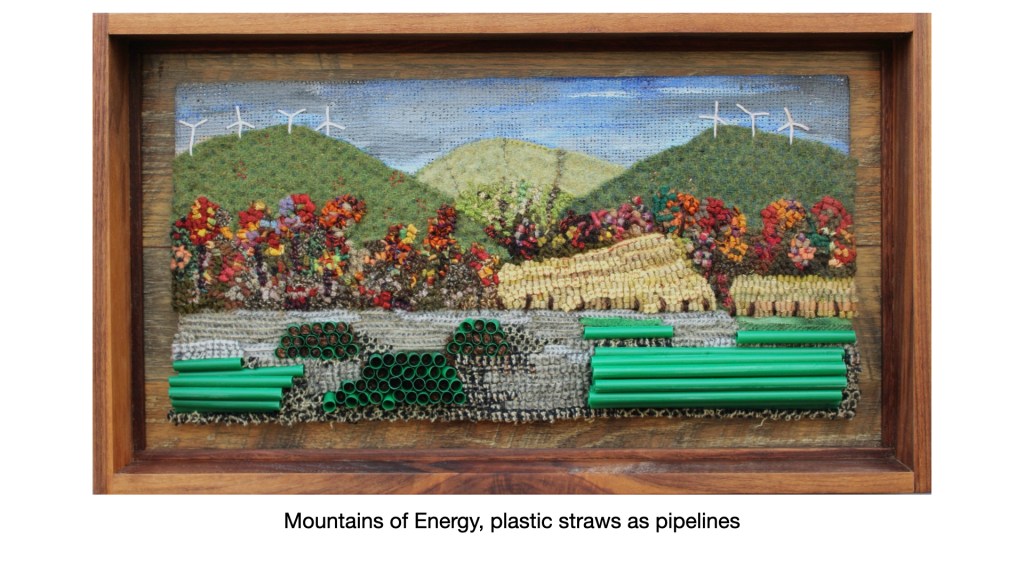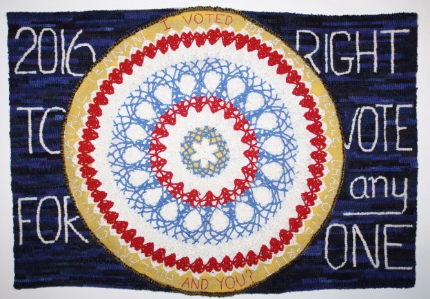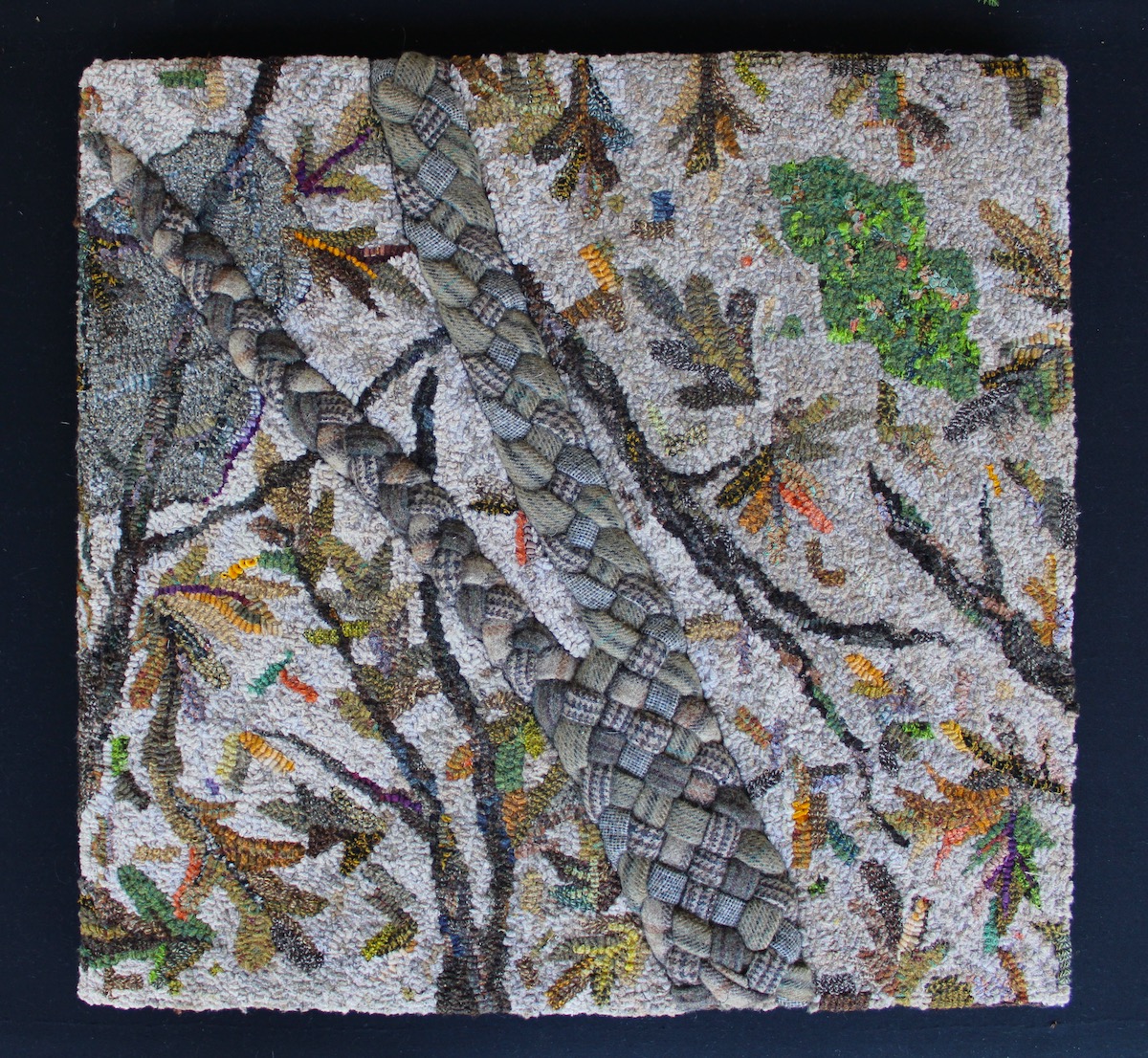 My art incorporates a variety of traditional handcraft techniques : hooking with fabric strips and other fibers, applique’, embroidery, beading, and making-do. I select these to accomplish dimensional effects in common flat work. Exploring historical motifs, reacting to the environment while traveling, and recently speaking loudly with words on some issues the work carries these messages into the future.