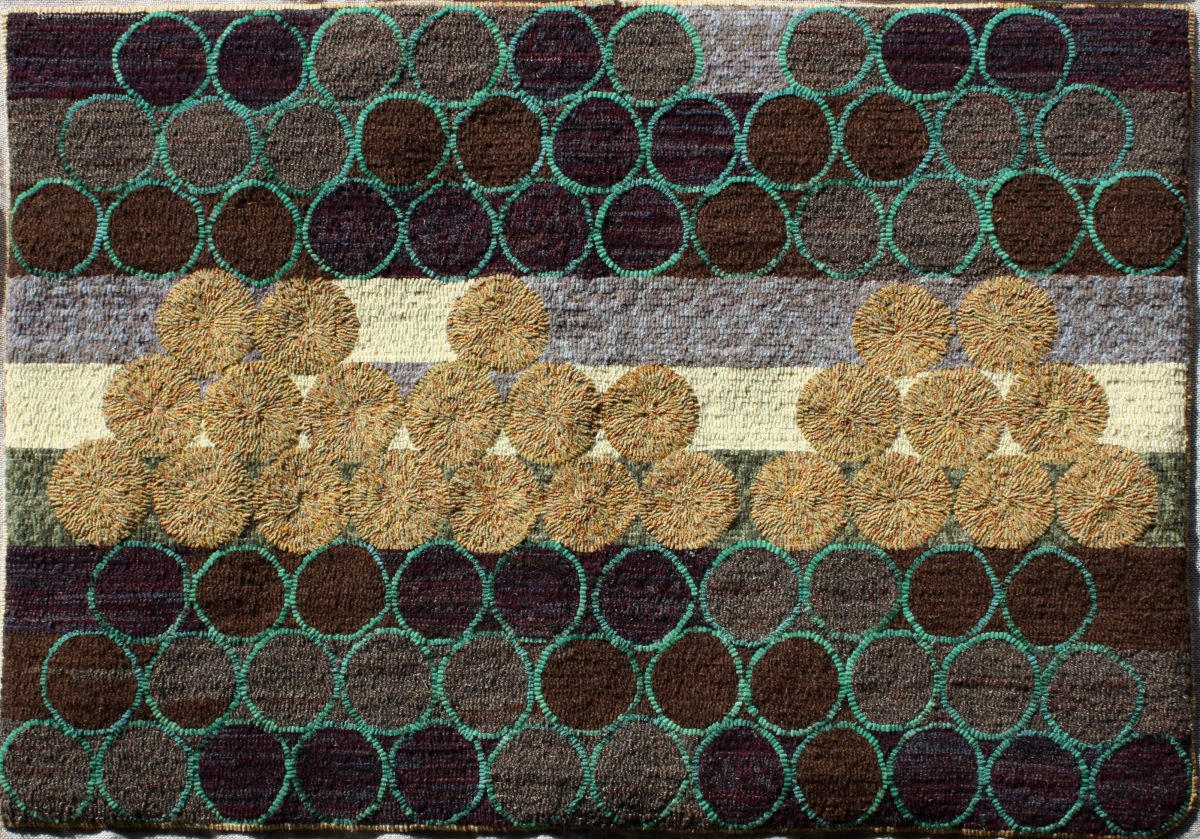 hand hooked wool fabric strips through linen depicting hay rolls in fields with sun and sky and the pipes stacked waiting to be installed to ship gas through WV