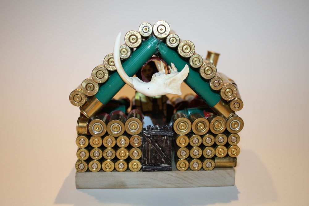 Shelter series by Jim Lilly 2016 exhibited at Schwenkfelder Library, brass cartridge shells, ground hog tooth, wood, artwork by Rebecca Wudarski,