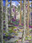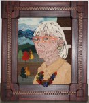 Self portrait including motifs which tell about my life in West Virginia, our log home, the mountains, trees (a common motif), orange glasses and gray hair. Working in mixed media adds to the autobiographical design. Frame designed by Jim Lilly. Visit ArtWools.com