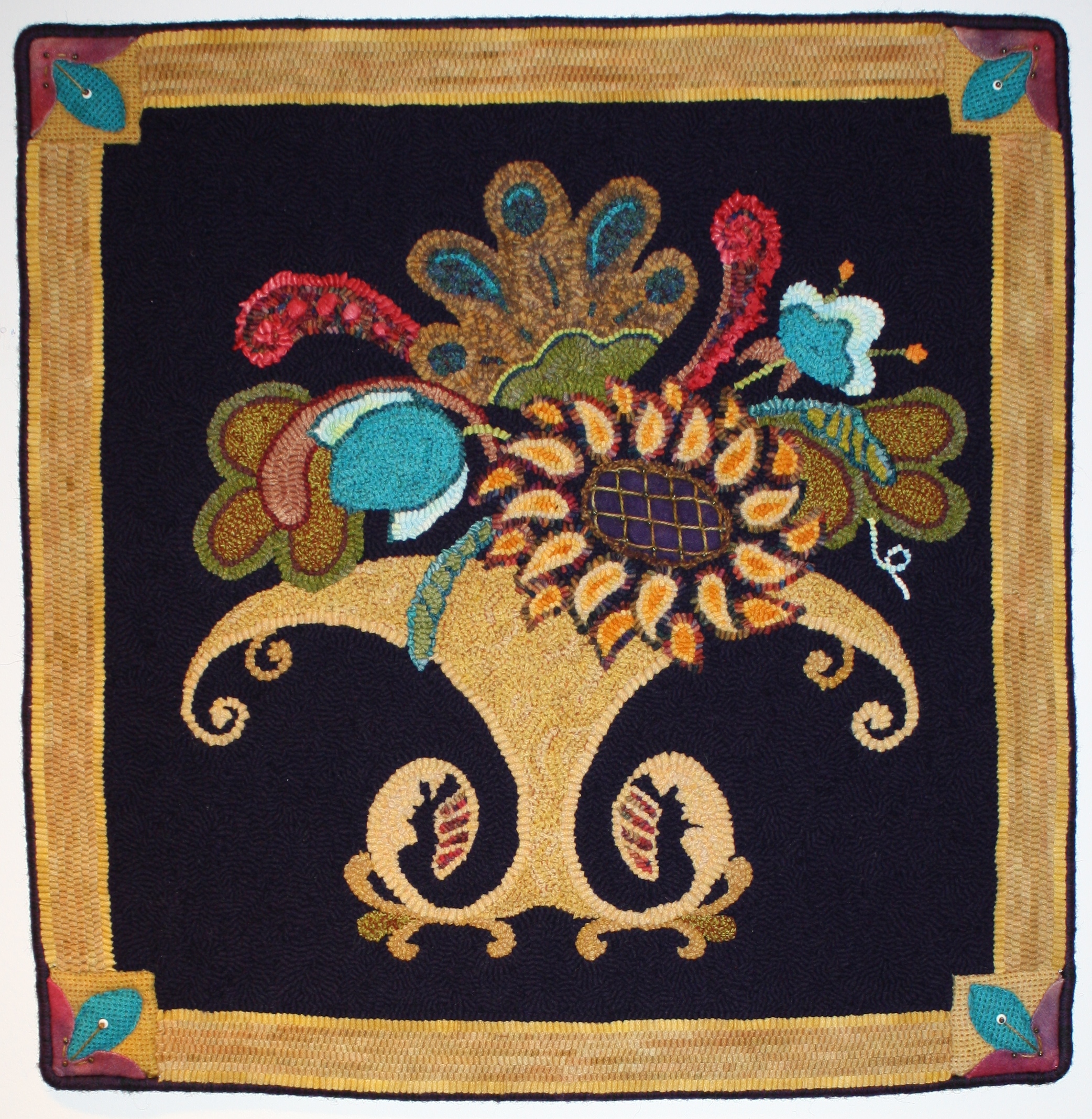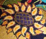 Embroidery skills are evident in the detailed cross hatch of the central flower and the quilted, appliqué corners. She also used beads and hooked in sari silk ribbon to highlight some accents and hand dyed all the wool.