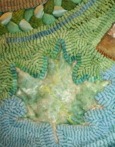 I used a ragged approach to the ends, cutting them off higher in many areas to depict the grass. In the area where the rolls are there is hand dyed wool anchored by the same yarn used int the roll.