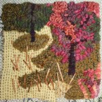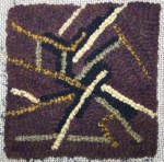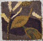 The finishing techniques we covered were triple whipping with cording conducted as a hands-on session by Nancy Parcels. Stumbles, success, and appreciation were the compliments we shared with our samples. Lori LaBerge showed the layering involved to present her work for gallery sales by stitching the hooked work to gray herringbone, stretched onto art board with clean wrapped corners, cloth covering the back all of which is then inserted into a gold rimmed shadowbox frame. A whipped mitered corner was demonstrated from handout by Germaine James of Canada. Debra Smith showed how a picot crocheted edge enhances a whimsical design.