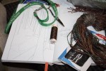 Piecing three colors of wool to wrap the cans, I attached the top and put on a bottom of corduroy with mat board buffering the cans and fabric. The sides were embroidered with simple flowers. I stuffed the two main flowers on the top but stitched the stems with embroidery threads anchoring them lower than the hooked loops.