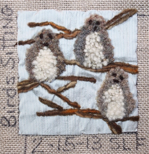 12-15-13 Birds Sitting Susan L Feller hooked yarns, embroidery on silk ← Previous Next → 12-15-13 Birds Sitting; embroidery, hooked Susan L Feller, yarn hooked on silk fabric Like Loading...